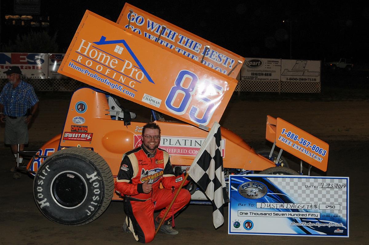 Lake Odessa, MI – Pulling off before the start of heat 2 with a broken spark plug, Dustin Daggett started at the rear of the B-Main to win it, giving him the 17th starting position in the feature where he worked his way through the field for his first feature win of the season, on night 3 of the Mid-Summer Triple Header.