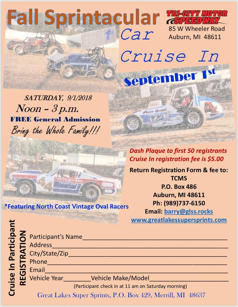 You can find a printable form on our Home Page on the website. Click on the Rules/Forms button at the top and it will be listed under 2018 Great Lakes Fall Sprintacular, titled Cruise In Registration.