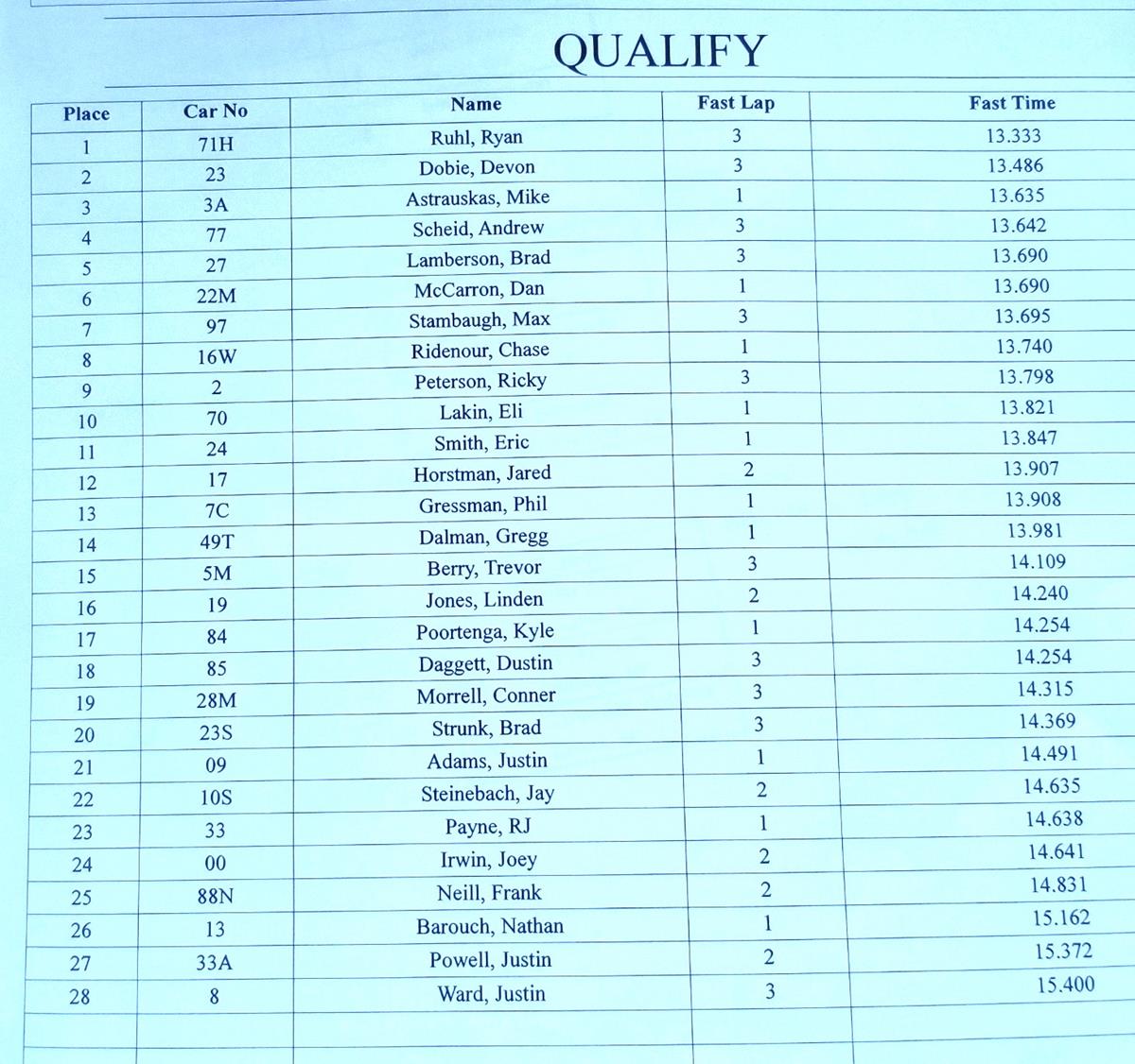 As qualifying wrapped up, Ryan Ruhl (Coldwater, MI) driving the Smith Racing 71 car, sat on top of the 29 car field, with the quick time of the class at a pedestrian 13.33 second lap. Devon Dobie (Wapakoneta, OH), Mike Astrauskas (Pierson, MI), Andrew Scheid (Sparta, MI) and Brad Lamberson (Parma, MI) rounded out the top 5 cars.