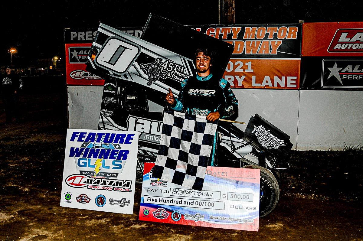 The Great Lakes Lightning Sprints, though a smaller motored and chassis, were just as their name implies as they were “lightning” quick on Friday night. It was Brandon Cascadden putting his name in the TMCS record books with track record of 11.506. Cascadden wasted no time showing that he was going to be tough to beat as he backed up his qualifying effort by winning his heat race ahead of Mack Erickson. The second heat race, it was Justin Ward edging out Brad Strunk at the finish. The third heat race was also a tight finish with Jac Nickles beating Matt Cogley at the line. Mack Erickson and Jac Nickles led the field of seventeen to the green flag for their 20-lap feature. 2021 season point leader, Nickles, was the first to lead the race ahead of Brad Strunk and Mack Erickson. Strunk made good of a restart to take control of the field on the second lap. Multiple caution laps in the first six laps never let Strunk get away from the competition. Cascadden took advantage of a restart and snuck underneath the leader Struck. That pass ended up being the winning move as Cascadden cruised to the victory over Strunk, Nickels, Justin Ward, and Alex Cogley.